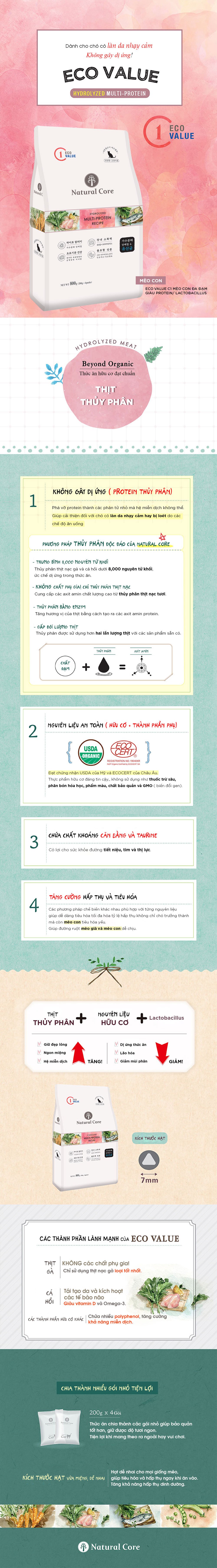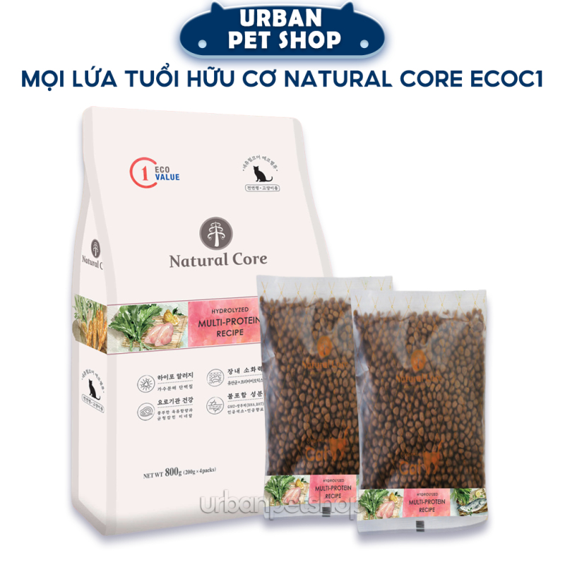 Thức ăn hữu cơ đa đạm cho mèo Natural Core ECOC1 sử dụng nguyên liệu chính là thịt gà và cá hồi rút xương được chế biến bằng công thức thuỷ phân độc quyền giúp cải thiện chế độ dinh dưỡng cho sự phát triển của mèo.