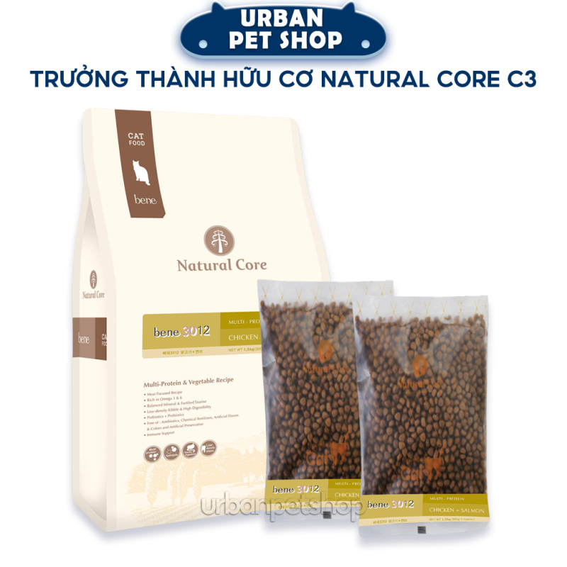 Thức ăn hữu cơ cho mèo Natural Core C3 Bene 3012 có nguyên liệu chính là thịt gà tươi và cá hồi rút xương đảm bảo nguồn đạm cho mèo cưng phát triển toàn diện.