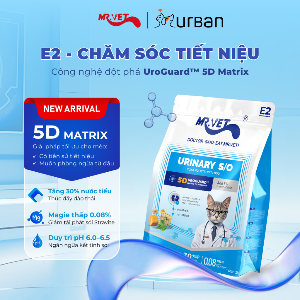 MR. VET E2 Urinary S/O là dòng thức ăn hạt Holistic cao cấp, được phát triển với công nghệ UroGuard™ 5D Matrix Technology – hệ thống bảo vệ 5 tầng chuyên biệt cho sức khỏe đường tiết niệu, giúp ngăn sỏi, hỗ trợ thận và duy trì độ pH nước tiểu ổn định cho mèo ở mọi giai đoạn phát triển.