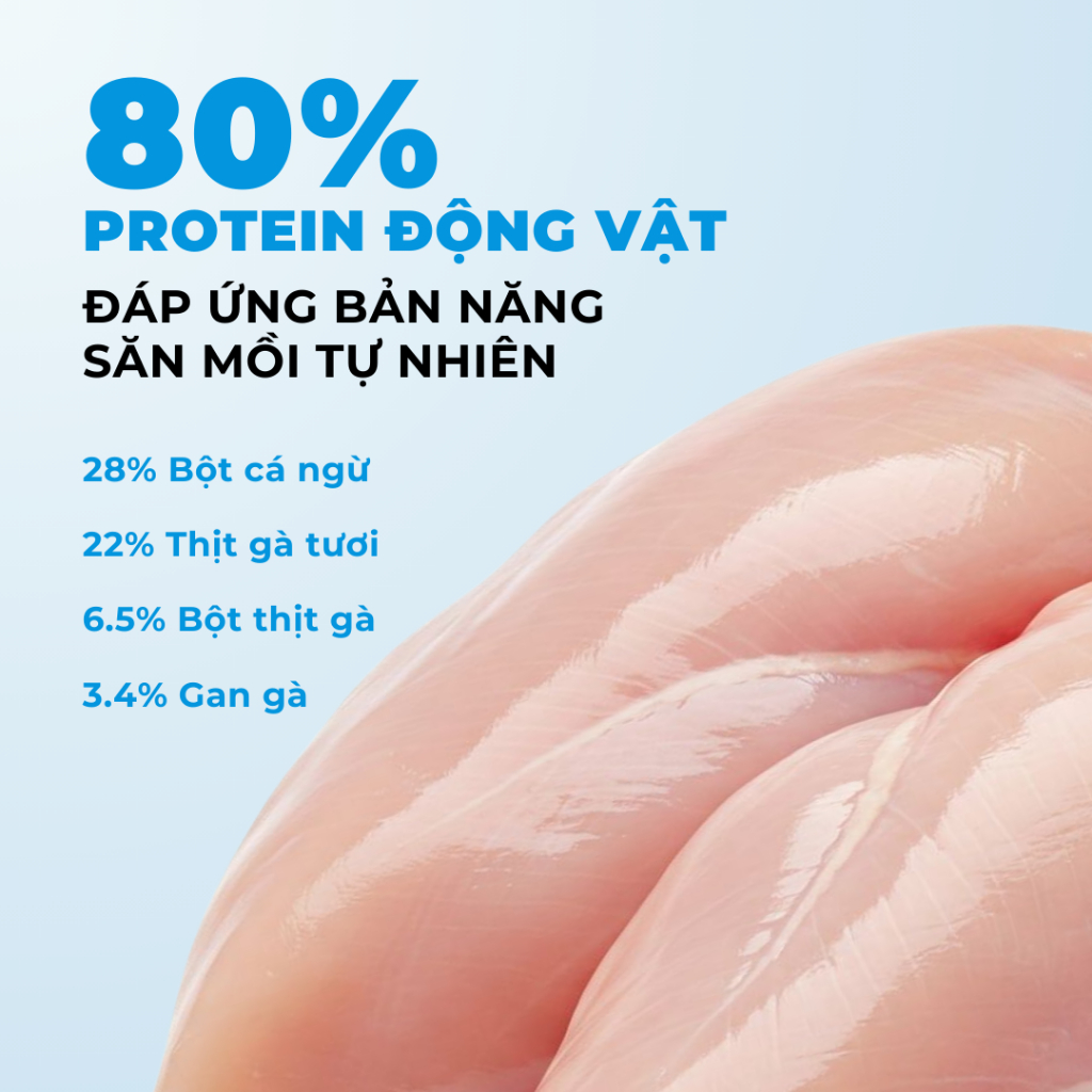• 50% protein cao cấp từ cá ngừ và thịt gà tươi: cơ bắp săn chắc, mèo ăn ngon hơn.