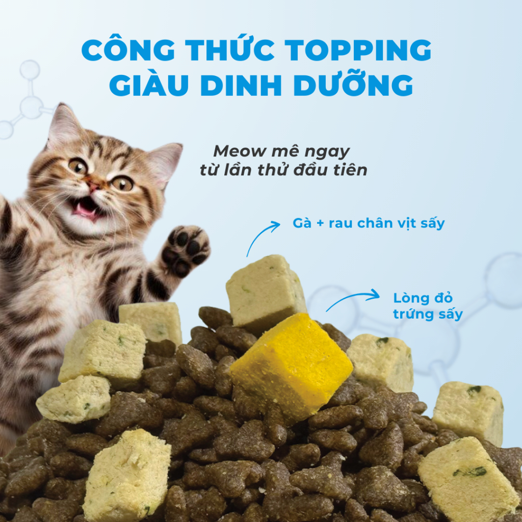 • Topping gà sấy & lòng đỏ trứng: tăng hương vị, bổ sung lutein và sắt, hỗ trợ tiêu hóa và thị lực.