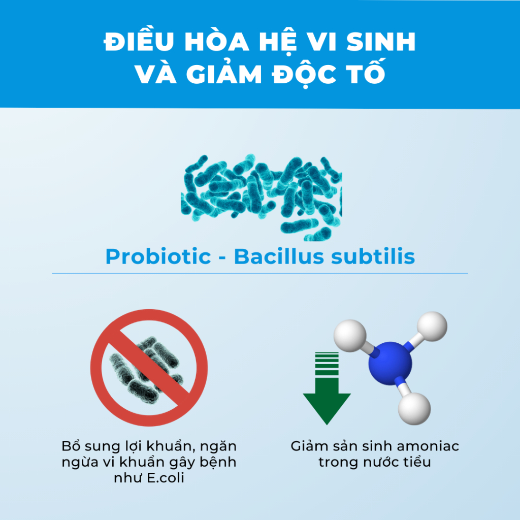 • Probiotic Bacillus subtilis + FOS: hỗ trợ lợi khuẩn đường ruột, giảm độc tố trong nước tiểu.