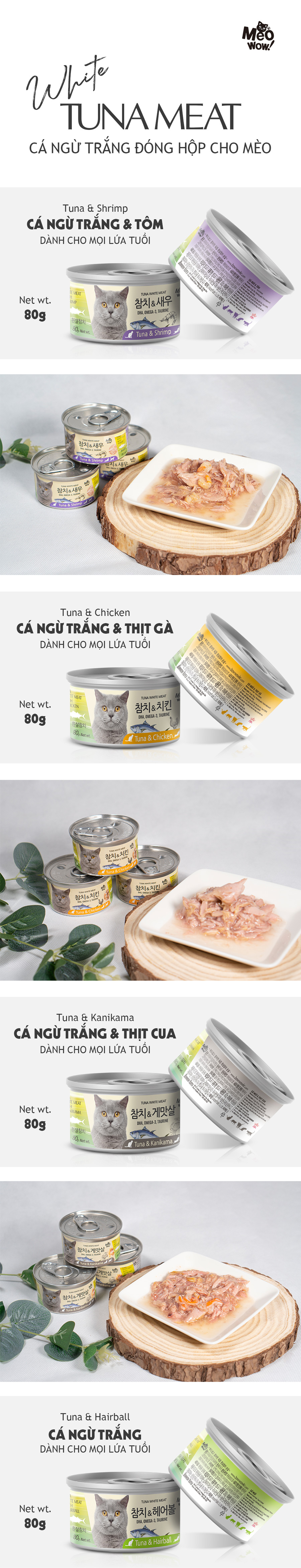 • Sử dụng thịt cá ngừ trắng và thịt gà tươi, miếng cá mềm, kích thước nhỏ vừa ăn.