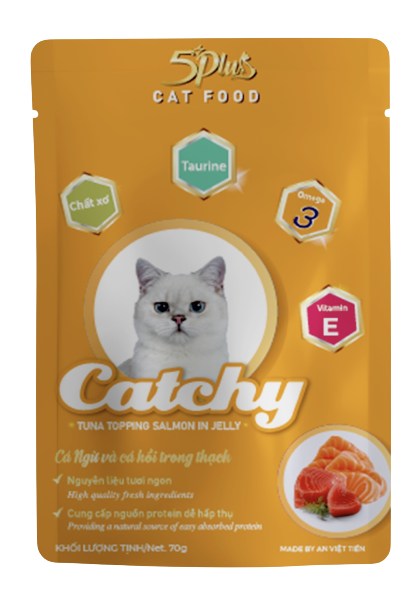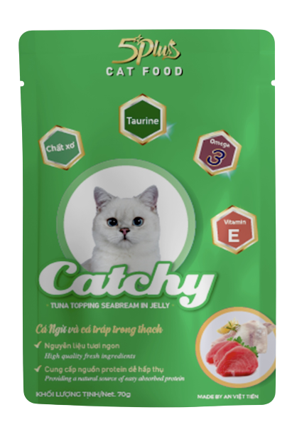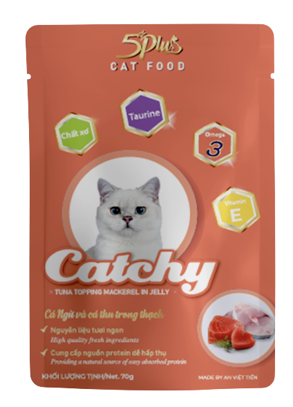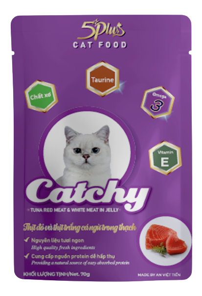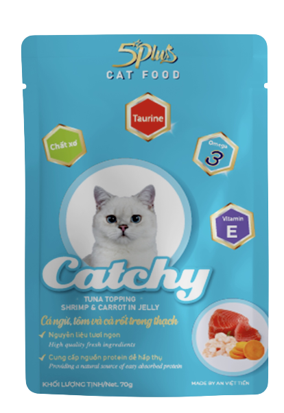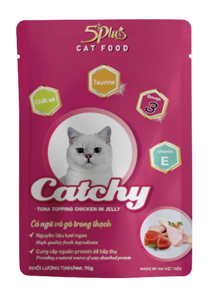 5PLUS CATCHY 70G cung cấp các dưỡng chất thiết yếu như: vitamin E, fructooligosaccharide, taurine. Qua đó, cung cấp nguồn protein tự nhiên dễ hấp thu và đảm bảo đầy đủ chất dinh dưỡng cho mèo của bạn phát triển 1 cách toàn diện.