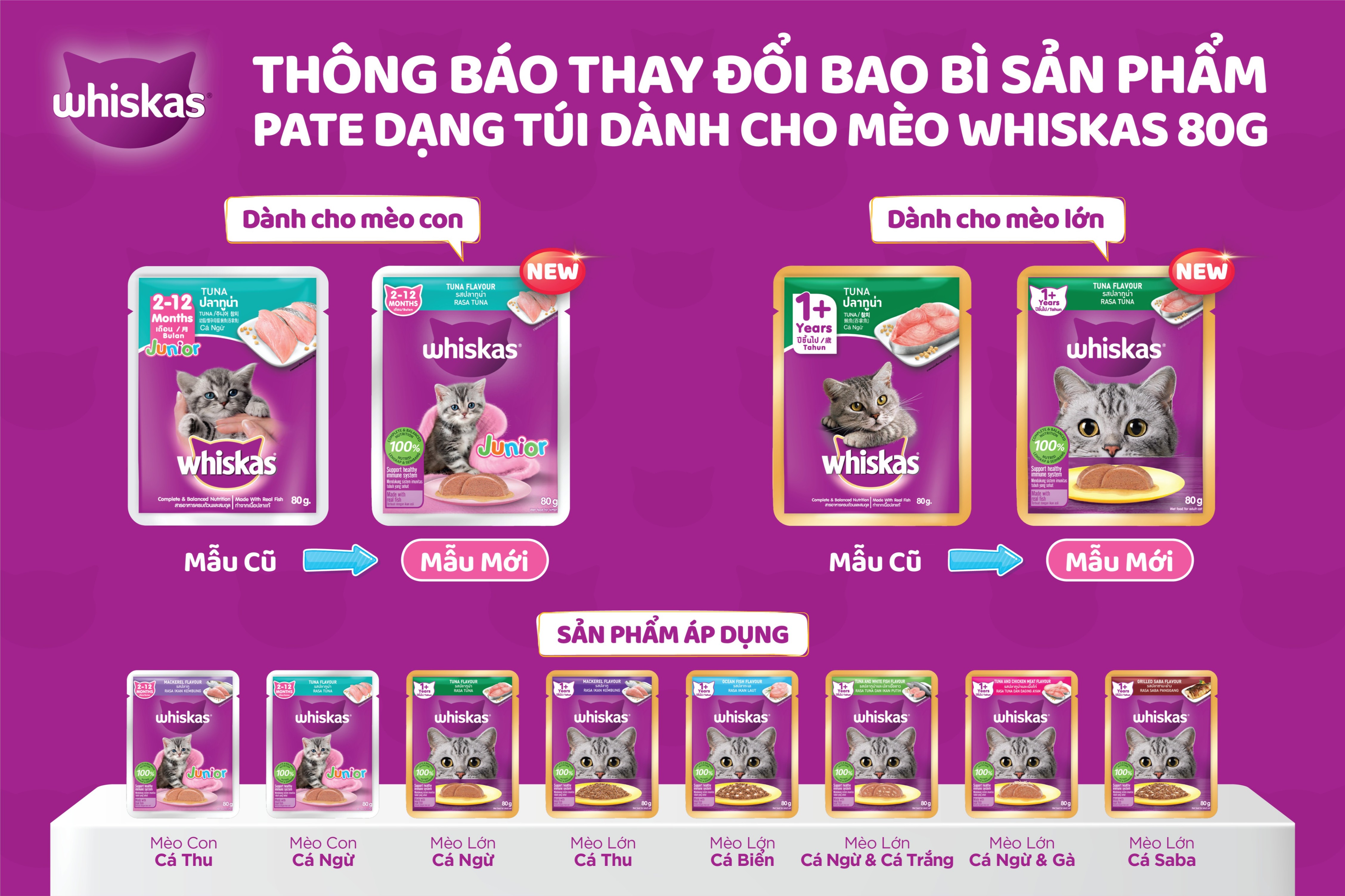 1. Whiskas® 1+ Mackerel Flavour | Cá Thu 2. Whiskas® 1+ Tuna Flavour | Cá Ngừ 3. Whiskas® 1+ Ocean Fish Flavour | Cá Biển 4. Whiskas® 1+ Years Grilled Saba Flavour | Cá Saba Nướng 5. Whiskas® 1+ Tuna & White Fish Flavour | Cá Ngừ & Ngừ Trắng 6. Whiskas® Adult Tuna & Chicken Meat Flavour | Cá Ngừ & Gà Tuyên bố của AAFCO