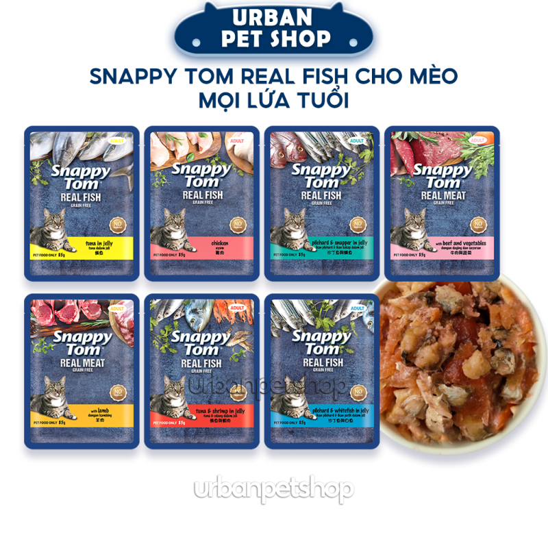 ➖  Dòng sản phẩm Snappy Tom Pouch được đóng gói với công thức đặc biệt kết hợp hải sản và thịt tự nhiên. Túi có 7 công thức được cân nhắc kỹ lưỡng, cung cấp các loại dưỡng chất thiết yếu khác nhau, giúp mèo phát triển toàn diện.